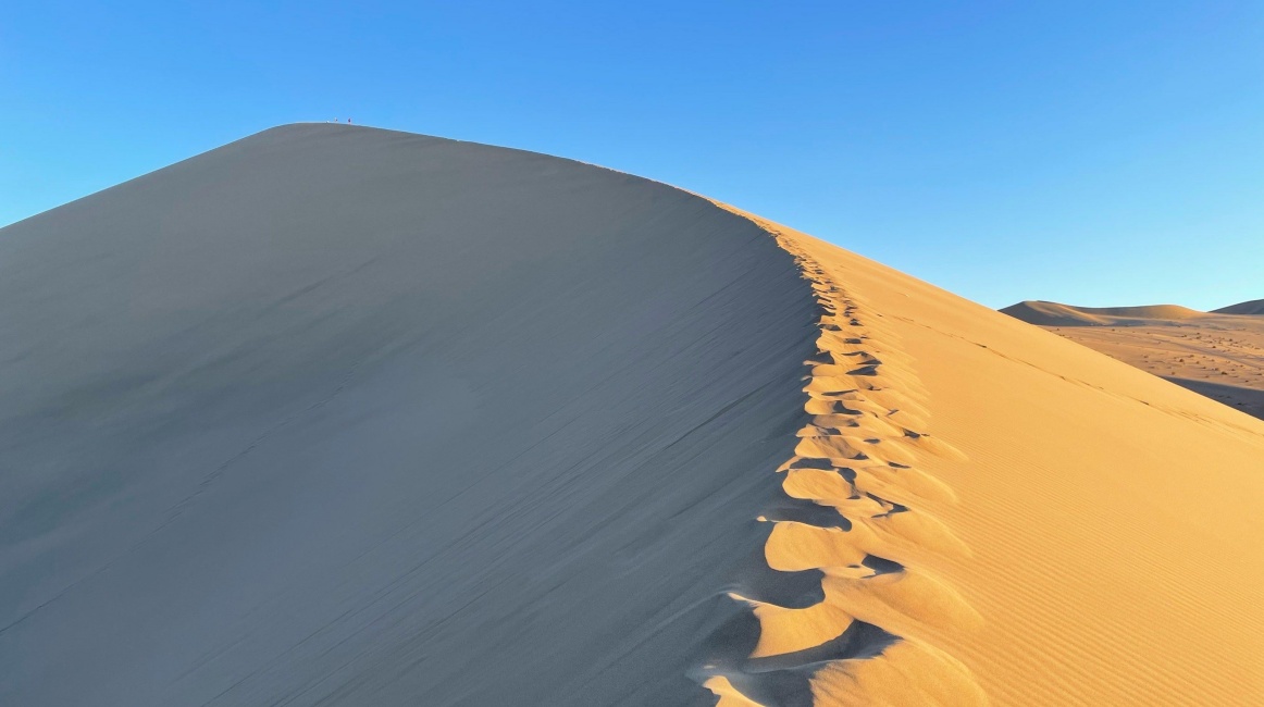 People who first come to Dunhuang are probably always shocked by the formation of the Mingsha Mountain. The sand mountain is steep, with sharp lines, and it shines golden light under the scorching sun. When the wind blows, the sand grains rub against each other, making a low sound, like the Buddhist sound from ancient times. Sand will flow, and the shape of the mountain you see today will be different tomorrow. The sand grains are very fine, and they slip through your fingers in an instant when you hold them in your hands, just like the time that cannot be held. Tourists like to slide down from the top of the mountain, listening to the sand singing and making happy calls. But the sand mountain is just silent, watching a thousand years of play, and will watch it for another thousand years.