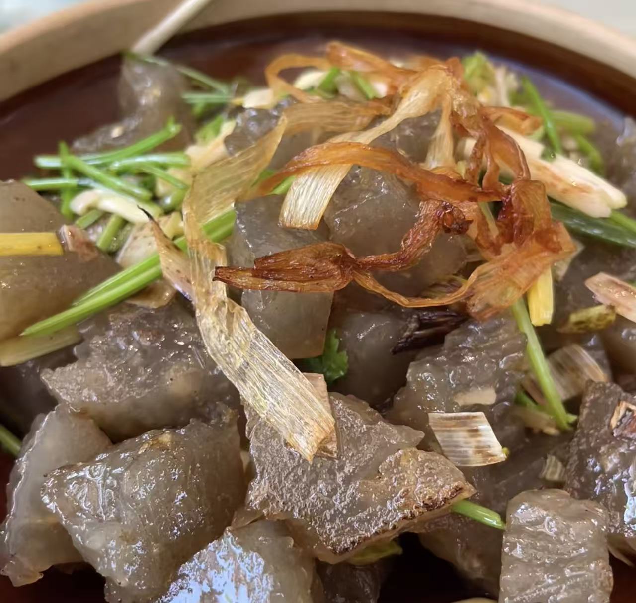 7. Skin residue, one of the "Three Treasures" of Anyang, is primarily made by steaming noodles with starch. It can be pan-fried, stir-fried, or stewed, resulting in a crispy exterior and tender interior. Often served with garlic sauce, it is a common ingredient in braised dishes.